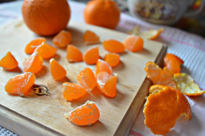 Мандарины очистить, и каждую дольку разрезать пополам.