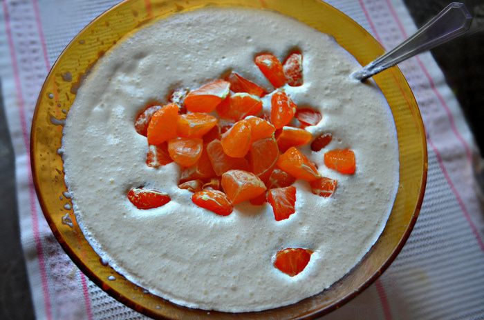 Соединить сливки с творожной массой и мандаринами.