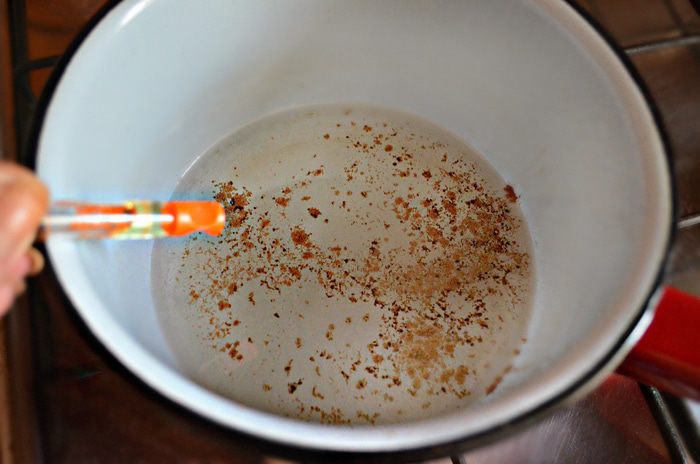 В небольшую кастрюлю влейте 150 мл воды, добавьте сахарный песок, корицу, апельсиновую эссенцию (при желании — апельсиновый ликёр) и нагреть. В получившимся сиропе распустить желатин.