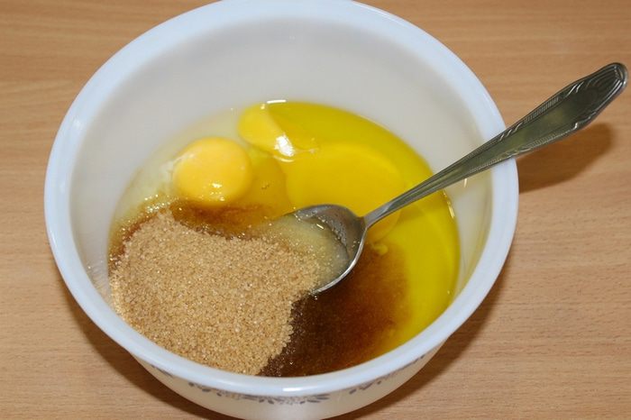 В отдельной миске смешайте мед, сахар, яйца, оливковое масло и хорошо перемешайте.