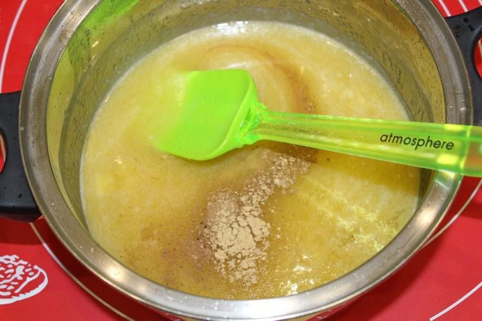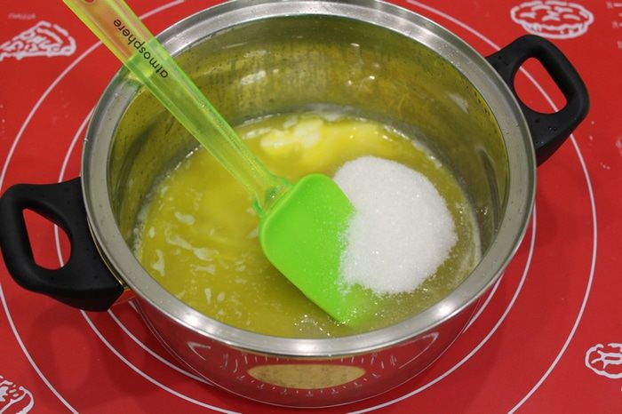 Растопить масло, добавить мед и сахар, хорошо перемешать.