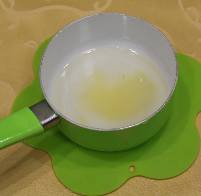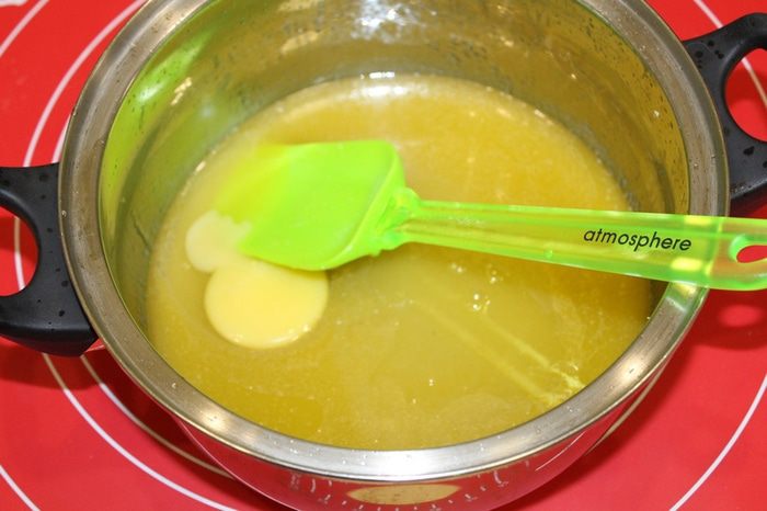 Для лимонной пасты необходимо смешать воду с сахаром, поставить на огонь растворить сахар, взвесить и добавить мёд, чтобы общее количество было 100 г.