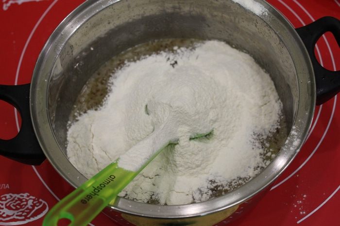 Немного остудить, по одному добавить яйца.