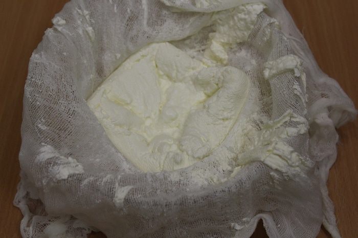 Йогурт необходимо отбросить на марлю, чтобы стекла лишняя вода.