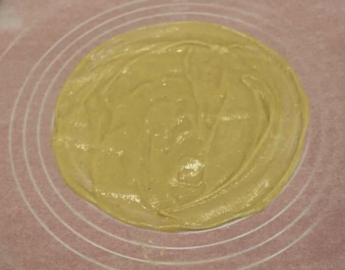 Замесить негустое тесто, начертить круг диаметром 18-20см, нанести ложкой тесто тонко