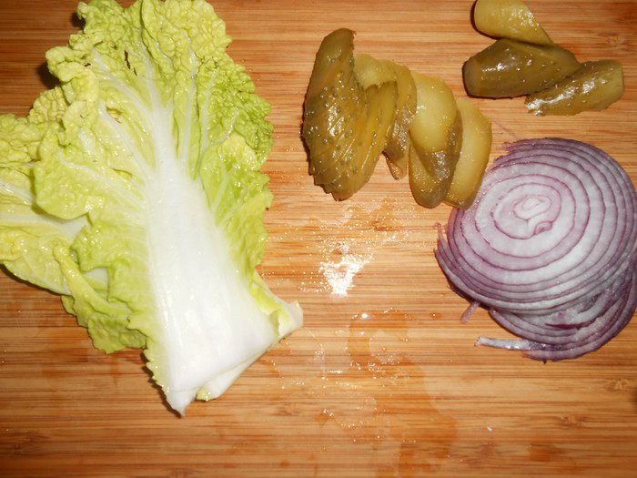 Пекинскую капусту помыть, удалить толстые прожилки. Я выбрала именно ее, а не салат, потому как капуста сочнее.