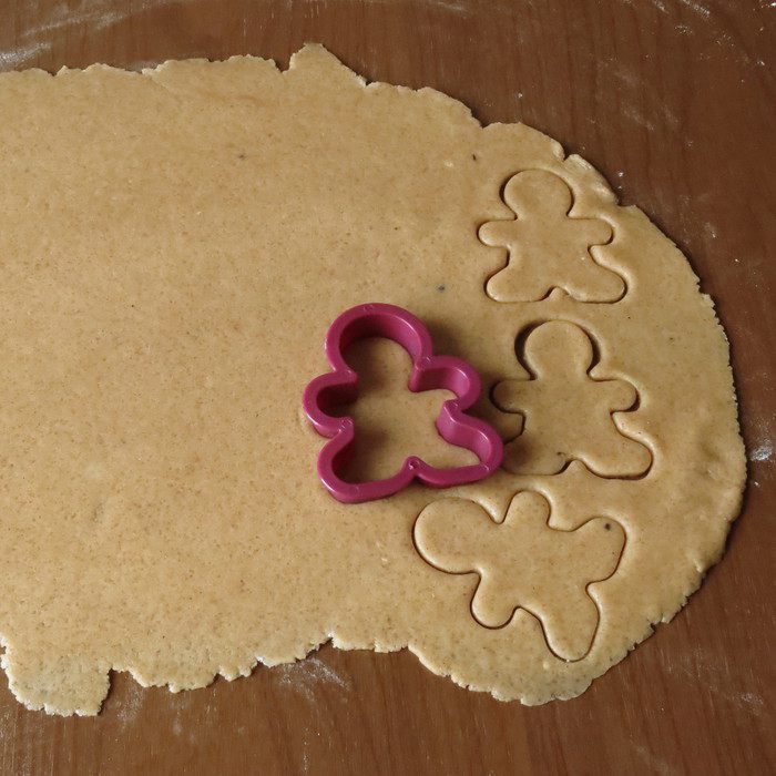 Раскатываем тесто и выбиваем фигурки человечков, я использовала маленькие и средние формы.