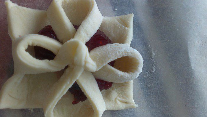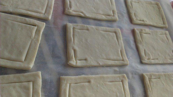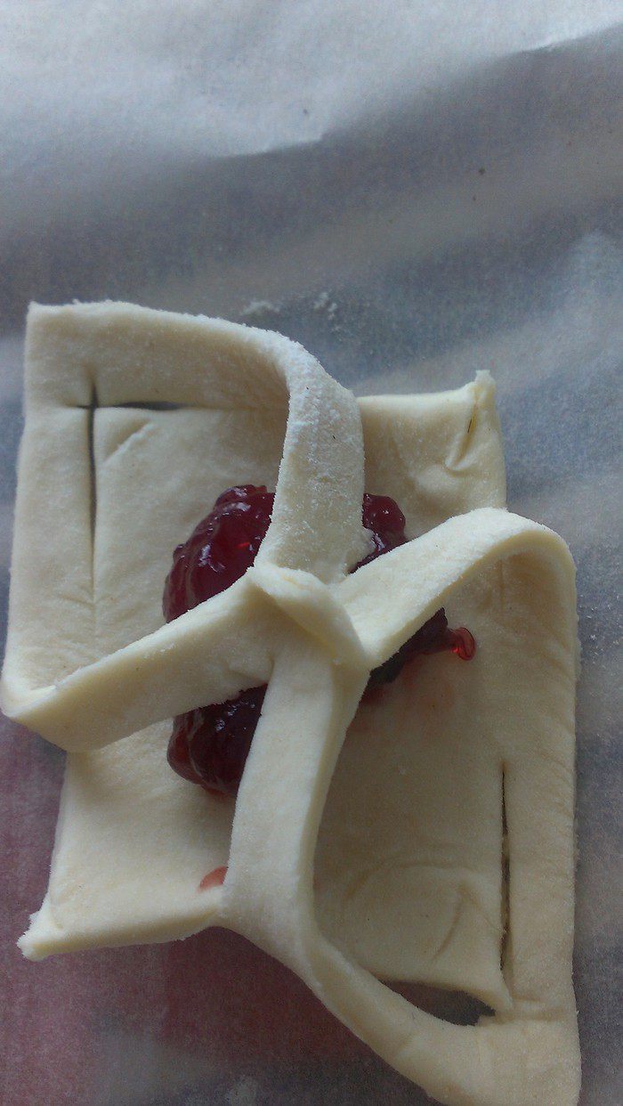 Выкладываем на противень (у меня застелен тефлоновой салфеткой). В середину каждого квадрата по чайной ложке повидла, либо другой (не жидкой) начинки на ваш вкус. Защипываем края между собой, нижний левый с верхним правым. Затем верхний левый и нижний правый.
