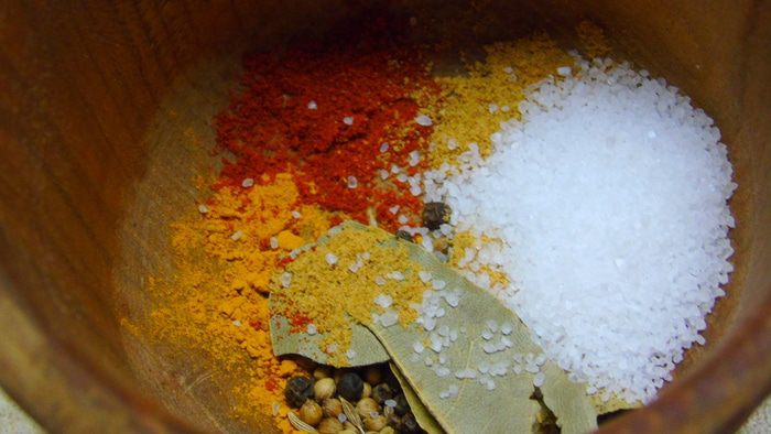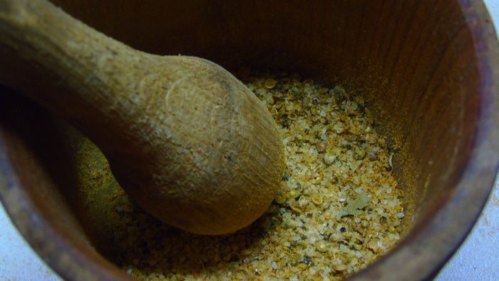 В самом начале приготовим пряную смесь. Для этого все специи смешиваем в ступке.