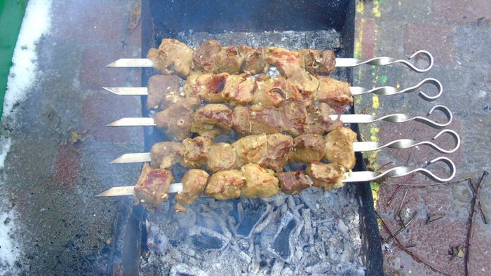 Когда угли "поседеют" можно жарить шашлыки. Как это делать вы сами знаете, но не чем не нужно поливать и самое главное не пережарьте их! Когда мясо на срезе будет еще розовым, а сок прозрачным — готово! Накройте их фольгой и оставьте постоять на краешке мангала, где нет углей минут 10.