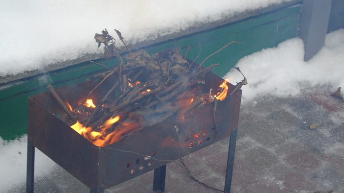 Разжигаем дрова-угли в мангале.