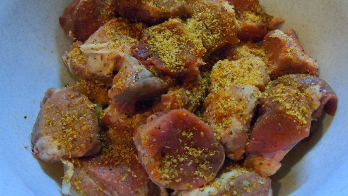 Свинину, лучше брать шейку, нарезаем кусочками 4х4х4 см, это примерно конечно, замерять не нужно :) Посыпаем пряной смесью, поливаем уксусом, соевым соусом и еще солим, соли в приправе не хватит. Перемешиваем и оставляем на полчаса.