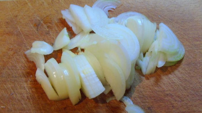 Этим временем нарезаем полукольцами лук и измельчаем чеснок.