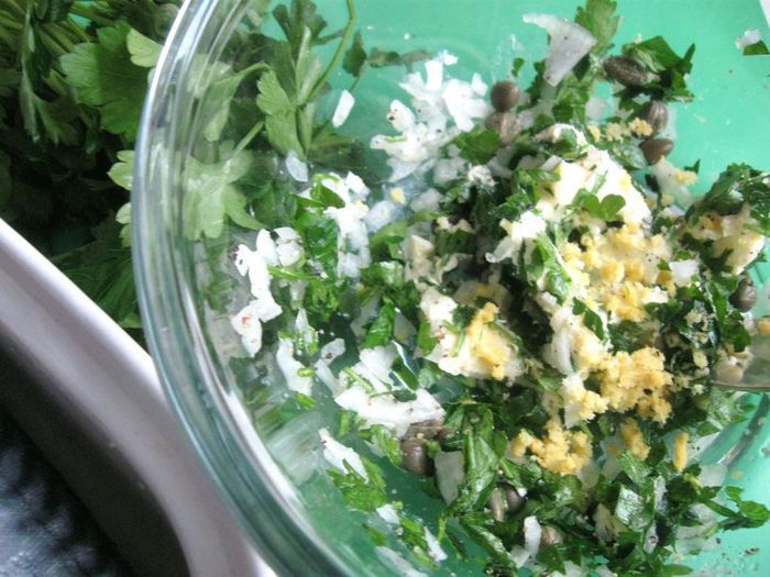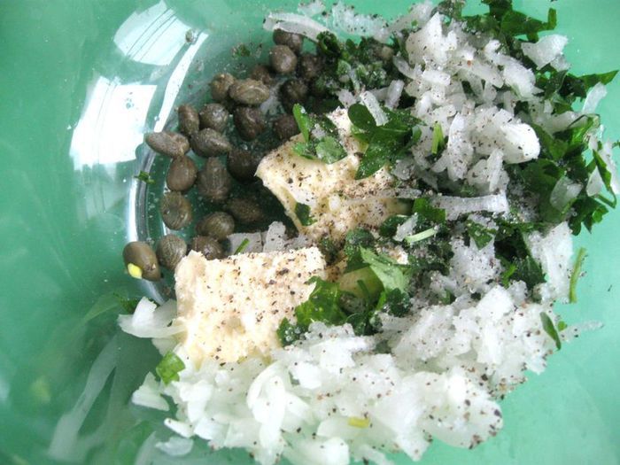 Выдавить лимонный сок в отдельную посуду (не переборщите с лимоном, каперсы дадут свой оттенок, рыба не должна получиться кислой), натереть цедру на мелкой терке, лук почистить, порезать мелко.