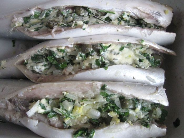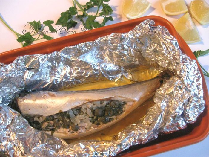 Скумбрию посолить, поперчить, сбрызнуть лимонным соком, оставить на время, пока будете делать смесь для фаршировки.