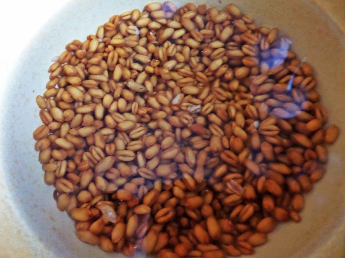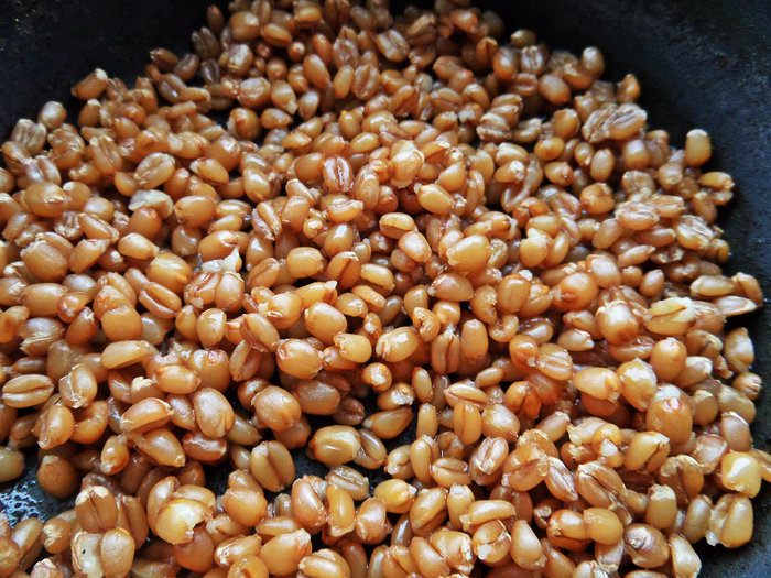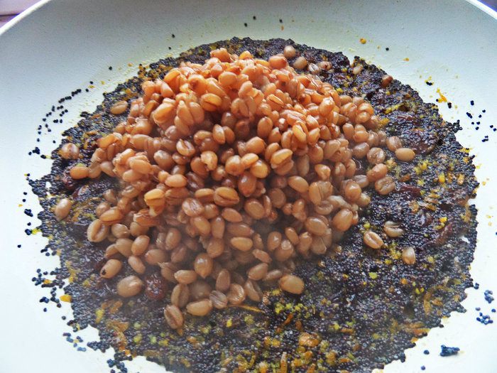 Когда сок выпарится, высыпаем готовую пшеницу.