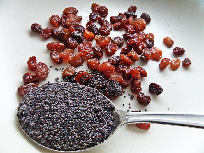 В сковороду насыпаем мак и промытый мелкий изюм горсточку. Можно брать и другие сухофрукты.