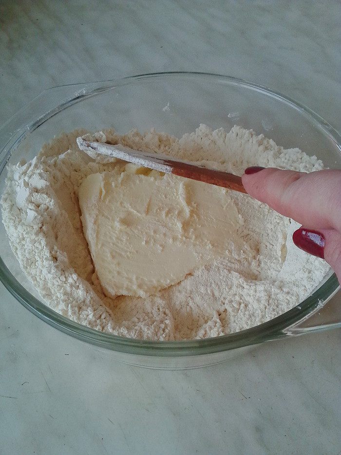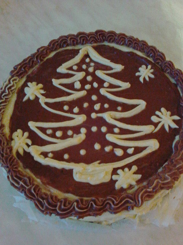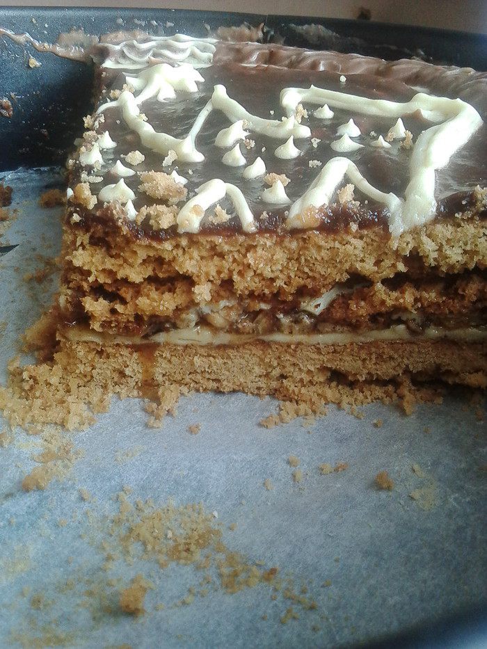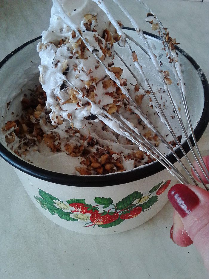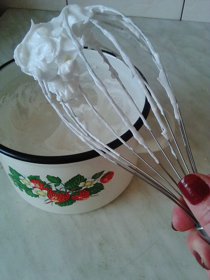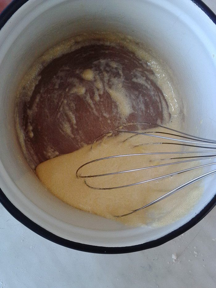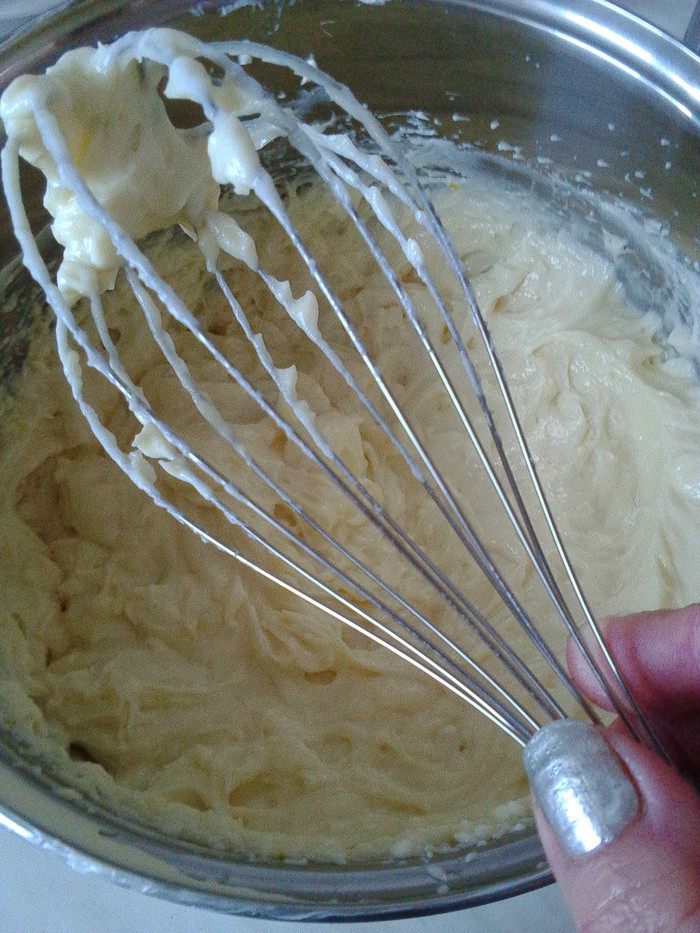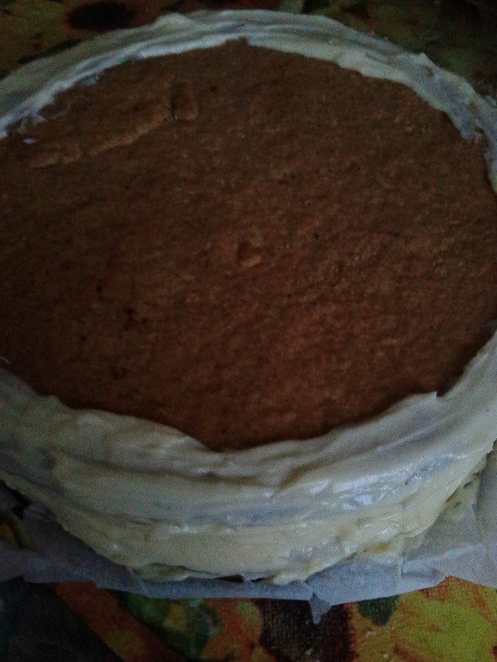 Пока коржи остывают, приготовим крем: 600 г молока в сотейнике поставим нагреваться, оставшиеся желтки и 200 г холодного молока смешаем с мукой, крахмалом и ванилью и, смешав до однородности, вводим в нагретое молоко. Проварить 1-2 минуты, хорошо остудить. Взбить мягкое масло с сахарной пудрой, добавляем к нему заварную молочную смесь частями, взбивая всё вместе пару минут. Крем должен получиться воздушным, пышным, плотным. Отложим несколько ложек крема и добавим какао 1-2 чайных ложки для декора верха торта.