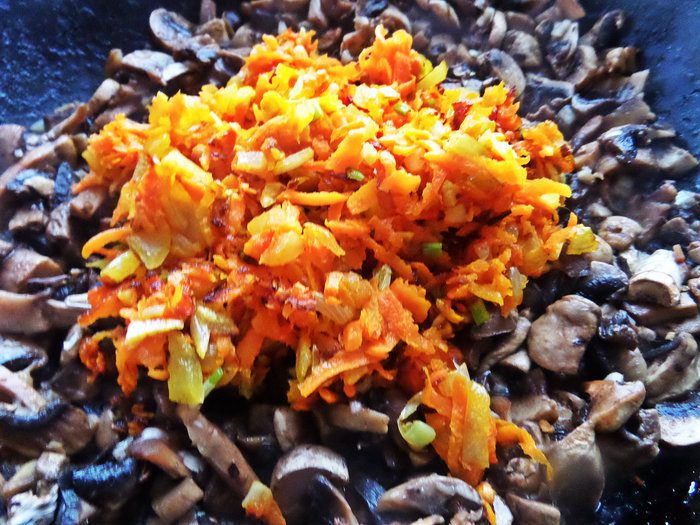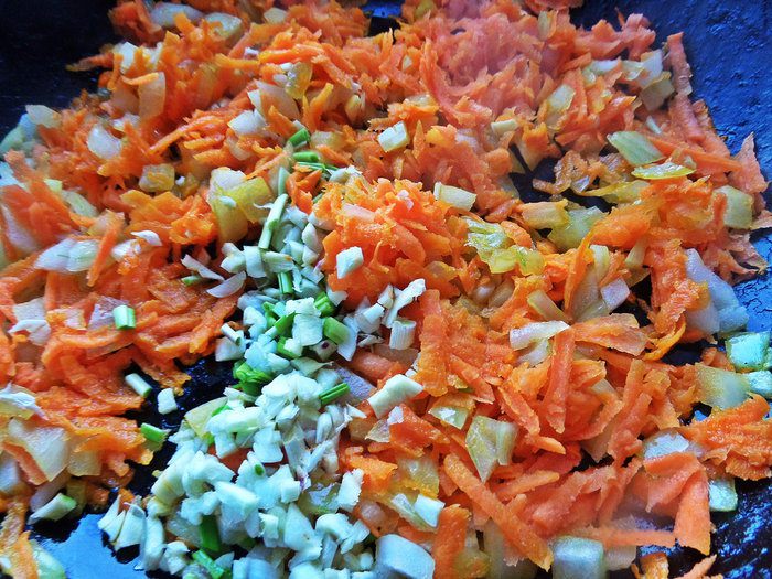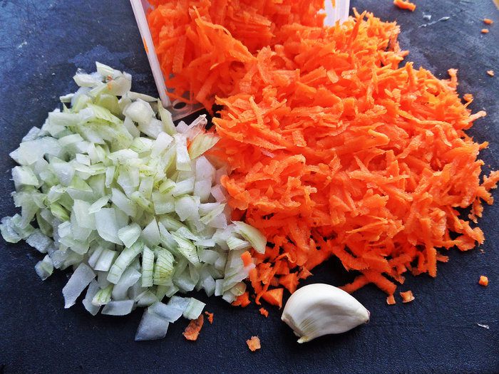 Измельчаем лук, чеснок, морковь натираем на крупной тёрке.