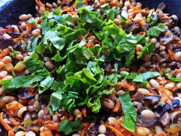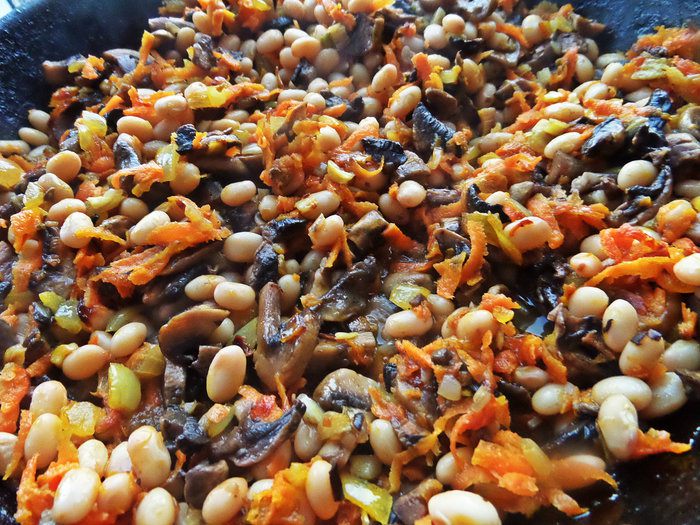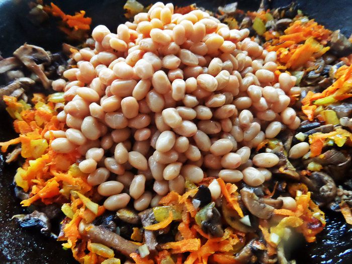Высыпать в сковороду готовую фасоль и влить пол стакана отвара, посолить.