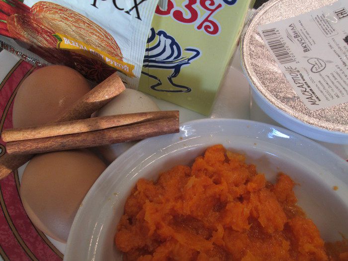 Подготовим ингредиенты. Тыквенное пюре лучше всего готовить из запеченной тыквы, т.к. оно не должно быть водянистым. У меня для таких целей есть готовое замороженное пюре.
