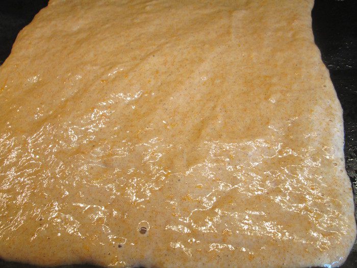 Выливаем тесто на противень, смазанный маслом и застеленный пекарской бумагой. Я использую тонкий силиконовый коврик. Выпекаем 10-12 минут при 190°С.