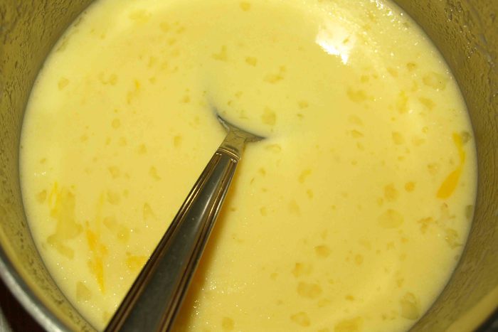 Яйцо взболтать. Добавить в растопленное масло яйцо и молоко. Хорошо перемешать.