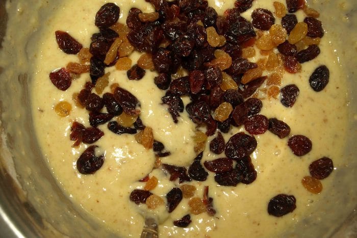 Добавляем изюм и клюкву. Перемешиваем.