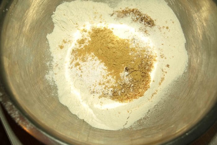 В миске смешать два вида муки. Добавить разрыхлитель, молотый имбирь, соль. Перемешать.