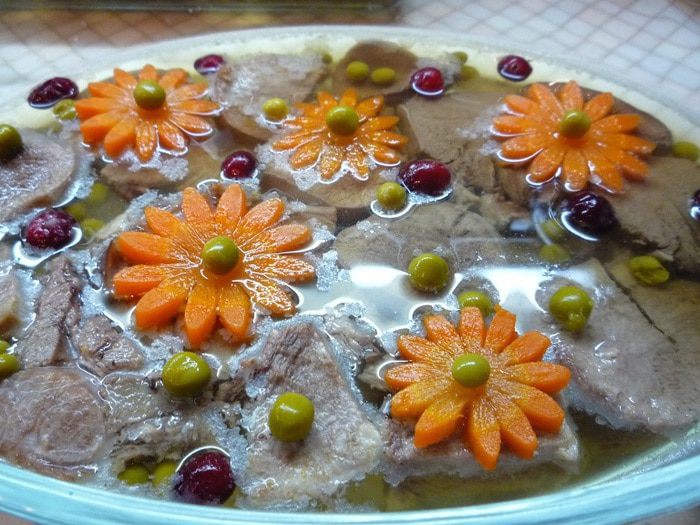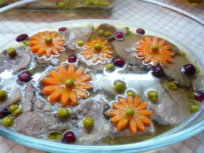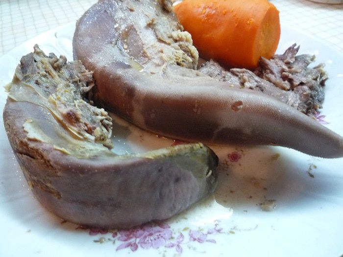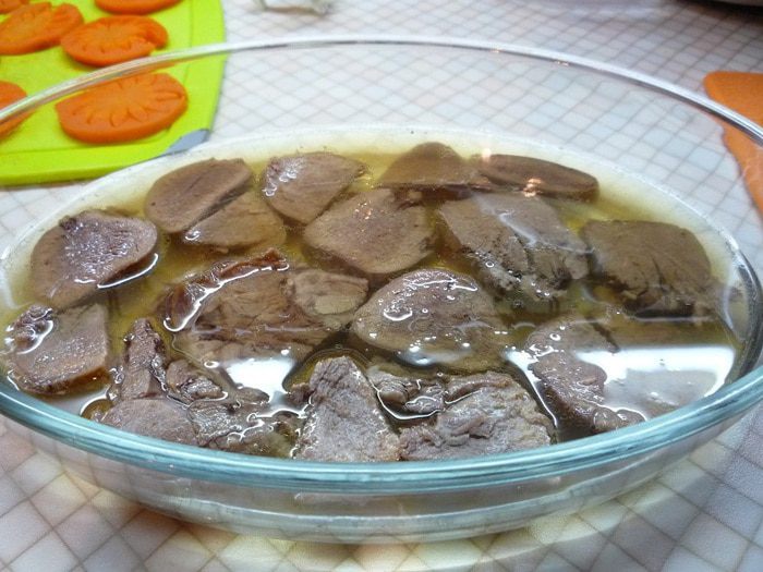 Говяжий и свиной языки моем и помещаем в кастрюлю с холодной водой так, чтобы они были полностью покрыты водой. После закипания, снимаем пену, убавляем огонь до минимального и варим языки 2-2,5 часа до готовности. Периодически очищаем поверхность воды от появившейся пенки. За 30 минут до окончания варки в кастрюлю добавляем лук, морковь, лавровый лист, соль, чеснок, перец.