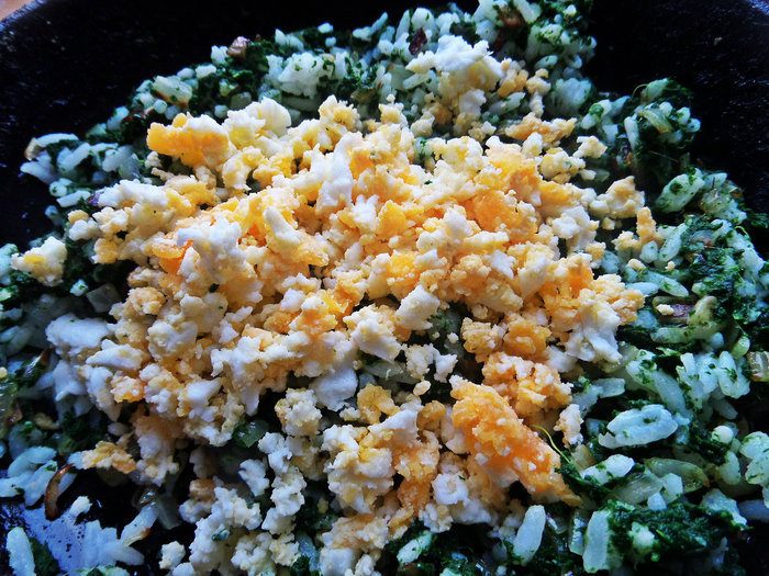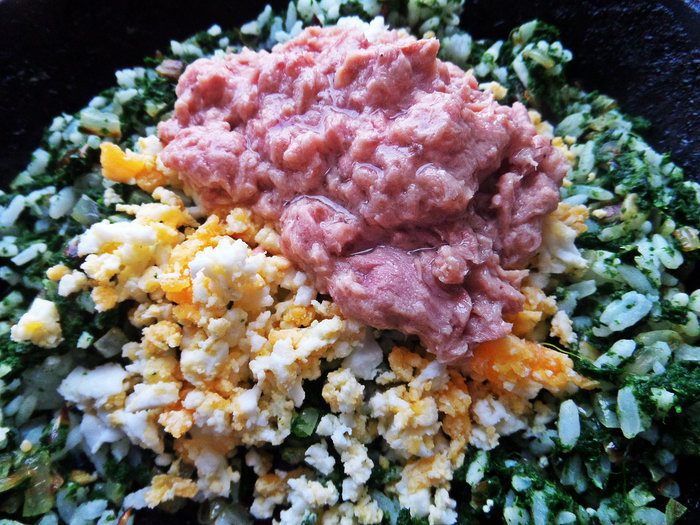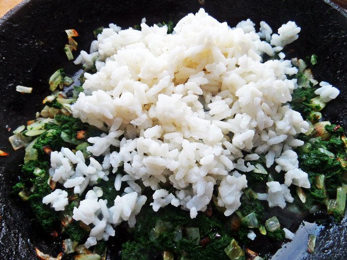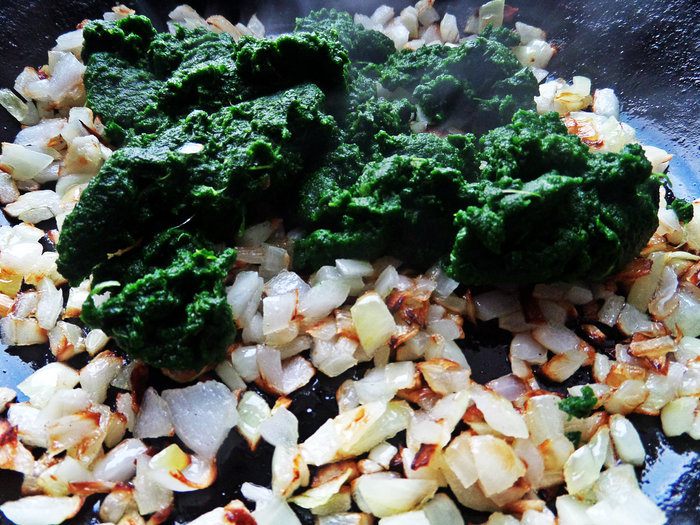 Для начинки я обжарила измельчённый лук, и прямо туда отправила почти размороженный шпинат.