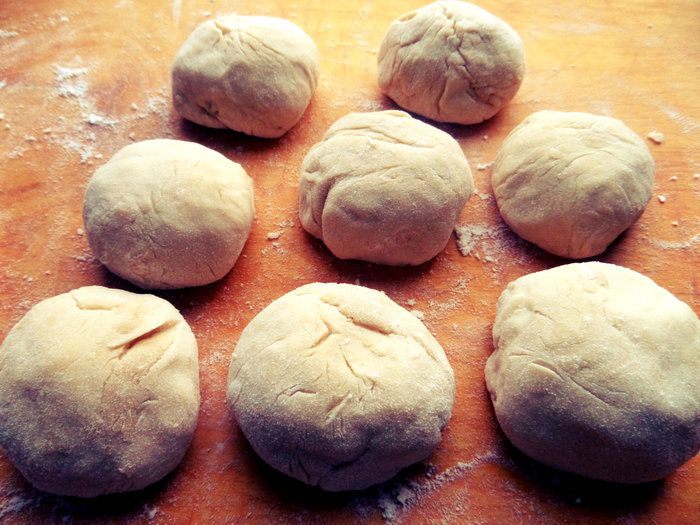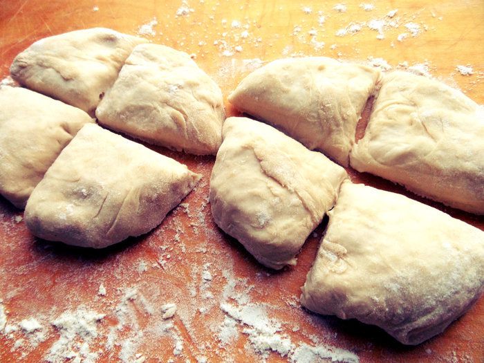 Когда тесто увеличится, разделить его на два шара, каждый шар поделить на четыре части.