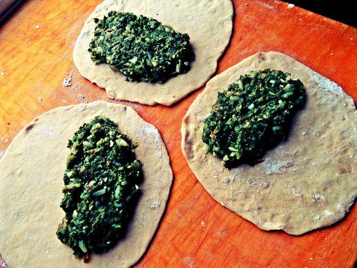 Раскатываем шарики теста в круг, и на половину разложим начинку — ложку с горкой, тогда хватит на все 8 пирожков.
