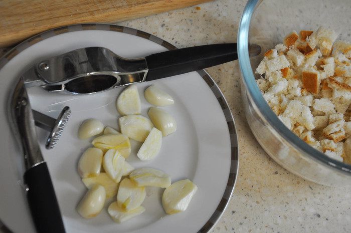 Пропустить чеснок через чеснокодавку или мелко порезать.