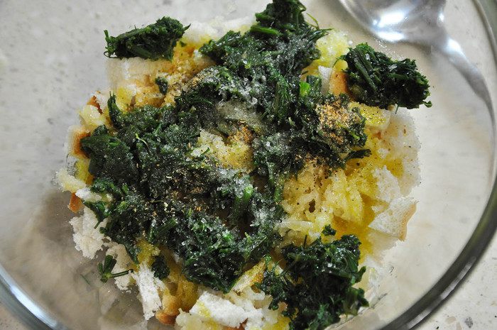 Смешать хлеб, зелень и чеснок. Посолить, поперчить и полить маслом. Перемешать