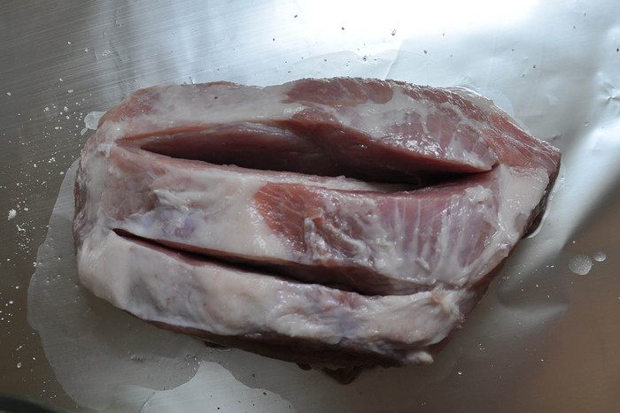 Сделать надрезы в мясе. Посолить его со всех сторон.