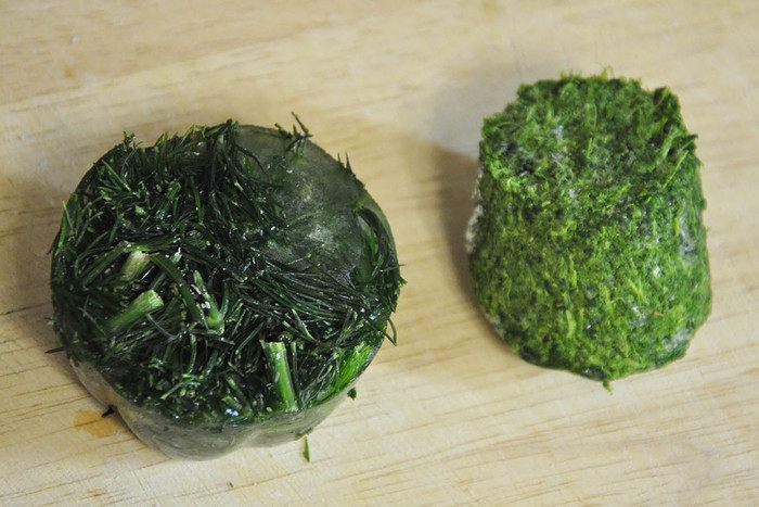 Шпинат и зелень я режу и замораживаю заранее, а потом опускаю в кипяток и процеживаю размороженную зелень через сито.