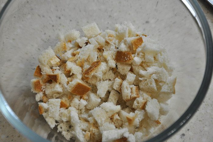 Батон порезать на мелкие кубики.