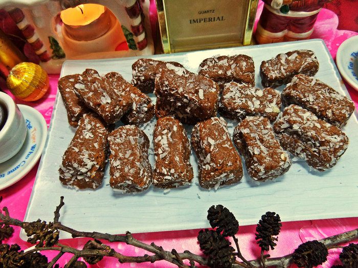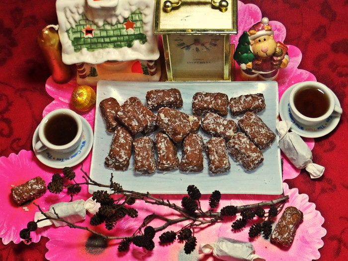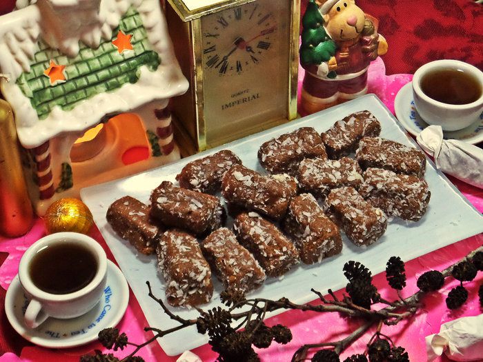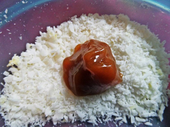 Когда остынет, берём комочек массы. Я решила обвалять в кокосе, можно в орешках.