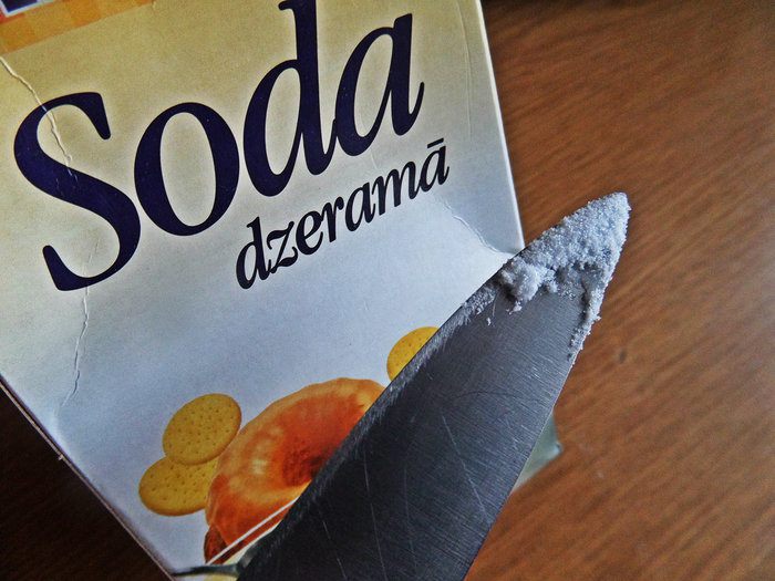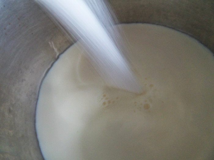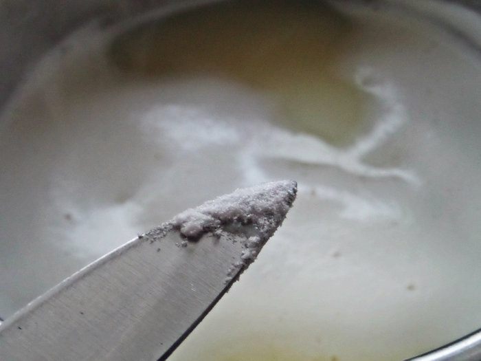 Растворяем сахар в молоке и добавим соду на кончике ножа.