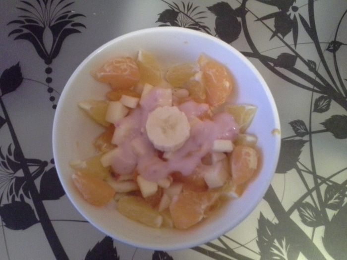 Сверху салата положить кружок банана, по бокам расставить апельсинки и мандаринки. Салат фруктовый готов!