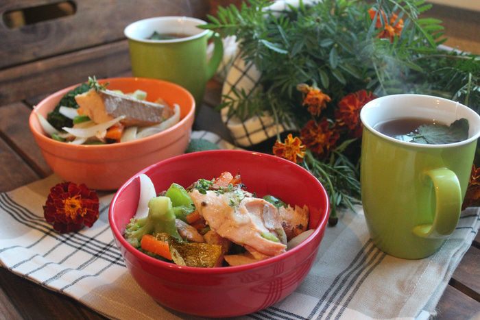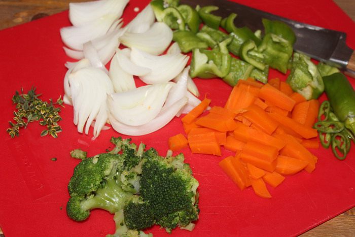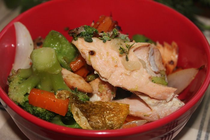 Хорошо разогрейте чесночное масло Biolio в большой сковороде (можно использовать вок). Положите в масло веточку тимьяна. На очень большом огне и быстро обжариваем: лук, сладкий и чили перец, морковь, брокколи. Добавить при необходимости соль и перец. Выложить рыбу, произвольно разломив ее руками на большие куски, обжарить секунд 30. Выложить блюдо в порционную посуду, сбрызнуть чесночным маслом Biolio, добавить свежие листики лимонного тимьяна и не забудьте положить хрустящую кожу, одним кусочком или разломив на мелкие и посыпав крошкой.