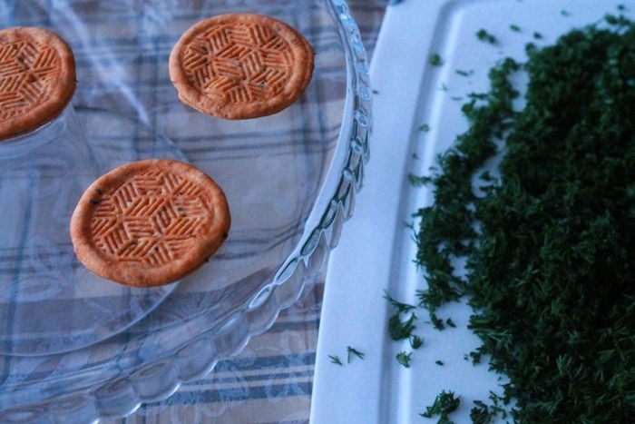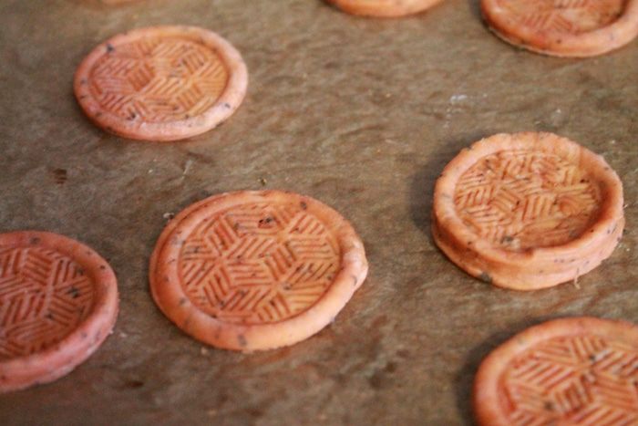 Подготовим тесто для крекеров. Для этого просеиваем муку, добавляем томатную пасту, базилик, измельченный чеснок, соль, растительное масло и по чуть-чуть вливаем воду (может быть воды уйдет чуть меньше). Замешиваем тесто и убираем в холодильник на 30 минут.