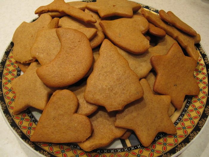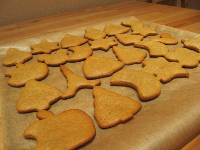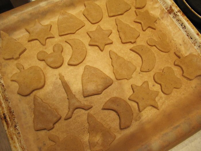 Тесто раскатать на слегка припыленной мукой поверхности в тонкий пласт и с помощью формочек вырезать печенье. Разложить на противне, застеленном пергаментом или силиконовым ковриком, и отправить в предварительно разогретую до 200°C духовку на 10-15 минут.
