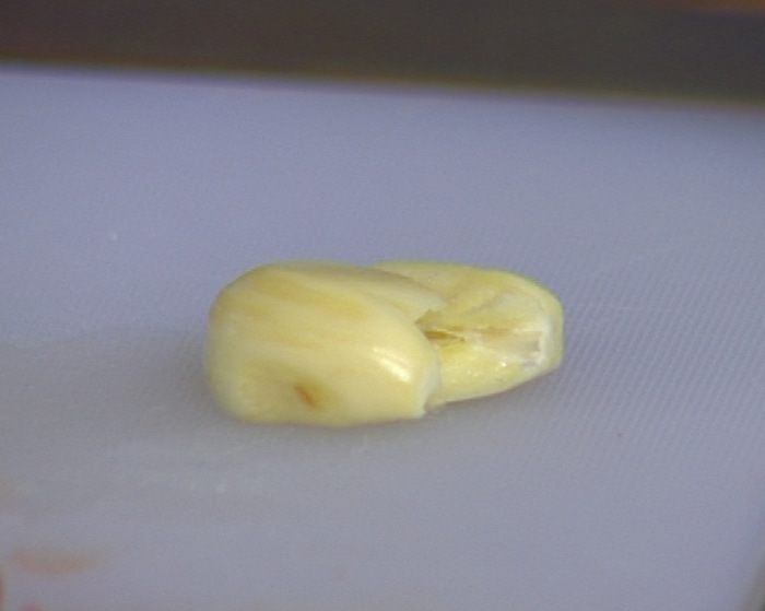 Чеснок почистить и раздавить плоской стороной ножа.