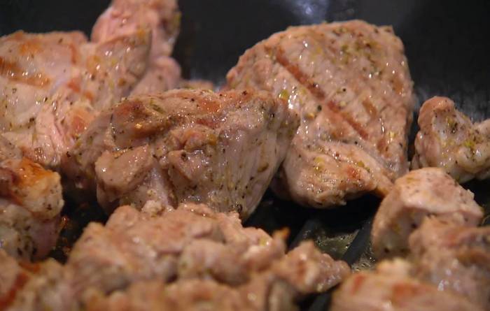 Разогреть сковороду-гриль и пожарить мясо со всех сторон до готовности.