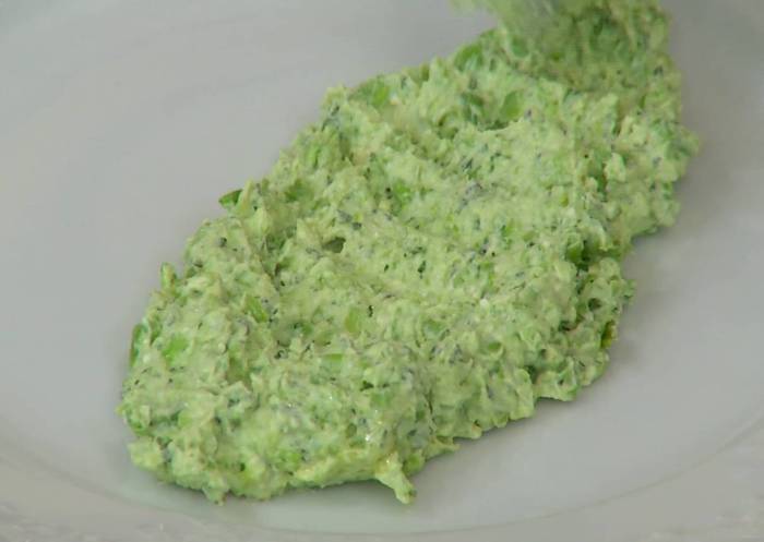 В чаше блендера соединить зеленый горошек, фету, чеснок и листья мяты, влить оливковое масло Extra Virgin и взбить все в неоднородное пюре, так чтобы остались небольшие кусочки горошка.