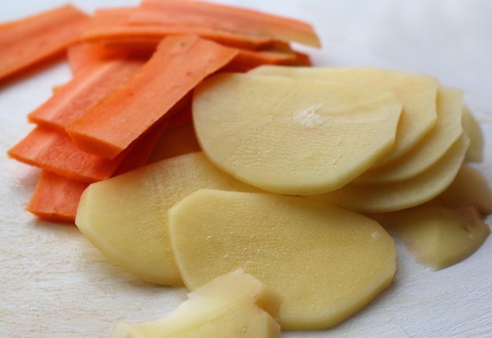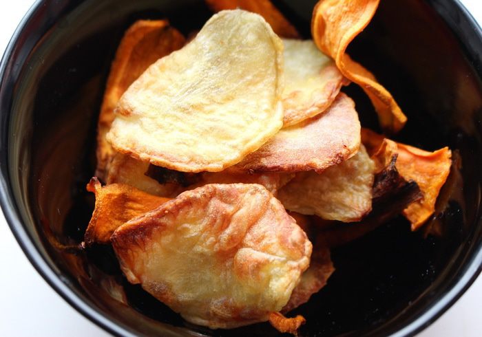 Сделать чипсы. Картофель и морковь почистить и натереть на терке-мандолине.
