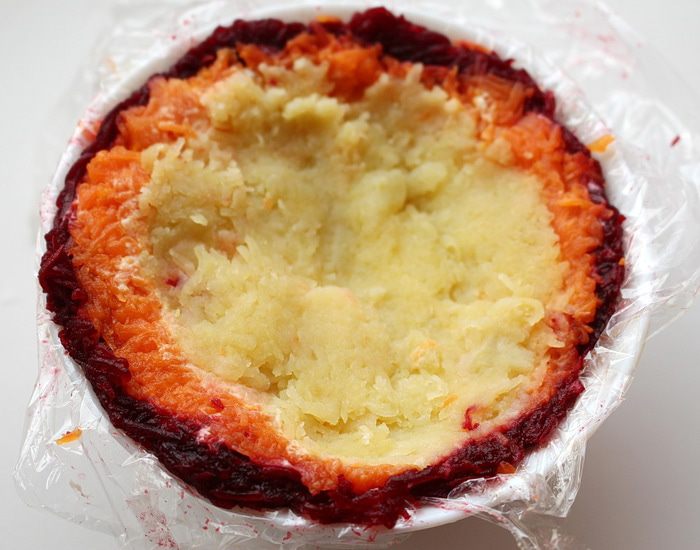 2 небольшие миски в форме полусферы застелить пищевой пленкой. В каждую миску выложить слоями свеклу, морковь, картофель, лук, сельдь и натертый белок. Между слоями промазывать майонезом и бальзамическим кремом.