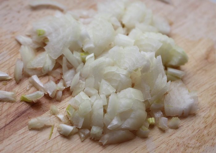 Репчатый лук мелко нарезать. Залить холодной водой на 15 минут, каждые пять минут меняя воду на свежую. Воду слить, лук отжать и промокнуть бумажным полотенцем.